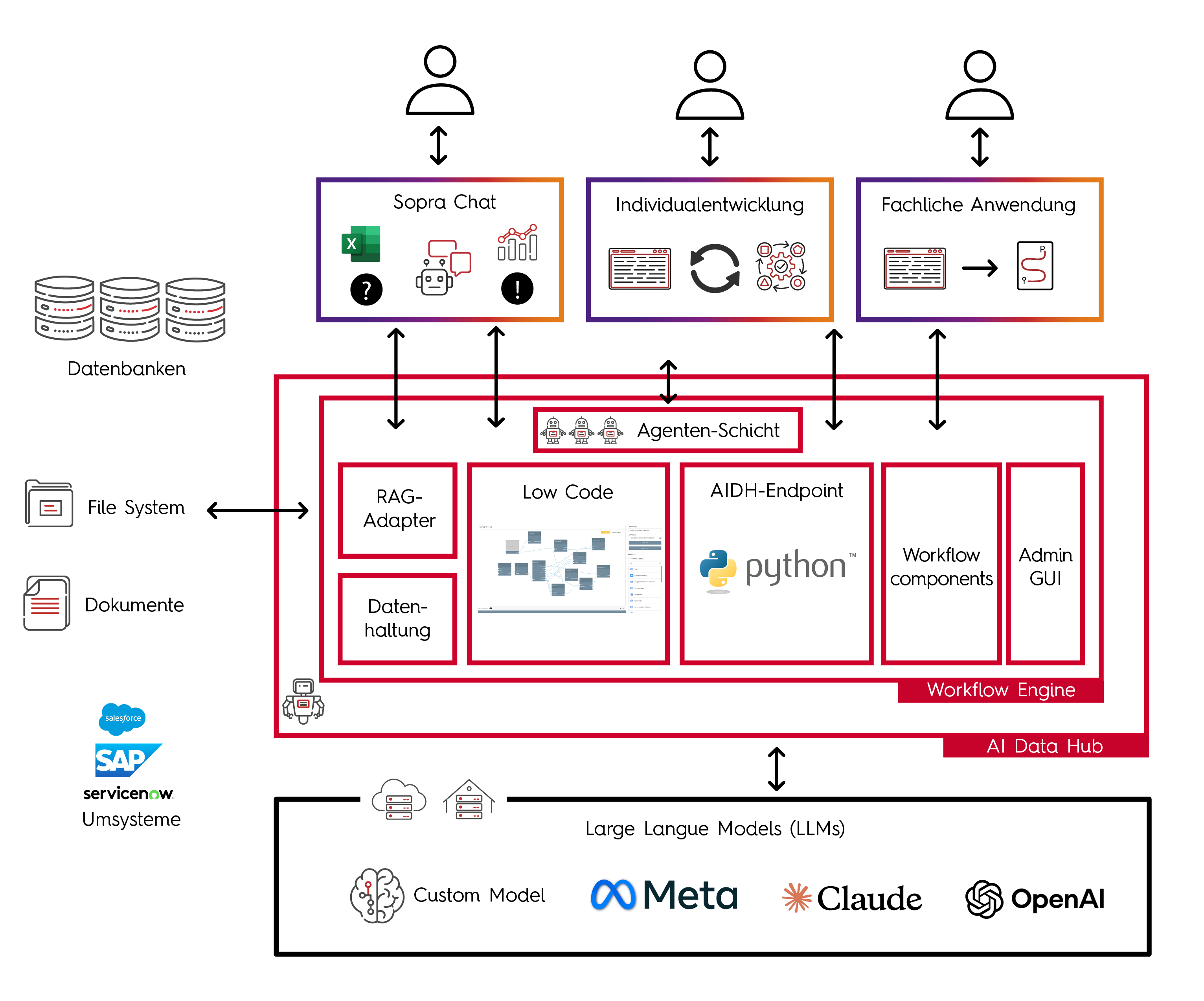 Mit dem AI Data Hub investieren Sie in eine zukunftsfähige Plattform für Ihre GenAI-Anwendungen. Dank der flexiblen Architektur der Plattform lassen sich neue Komponenten und Technologien schnell und unkompliziert integrieren.